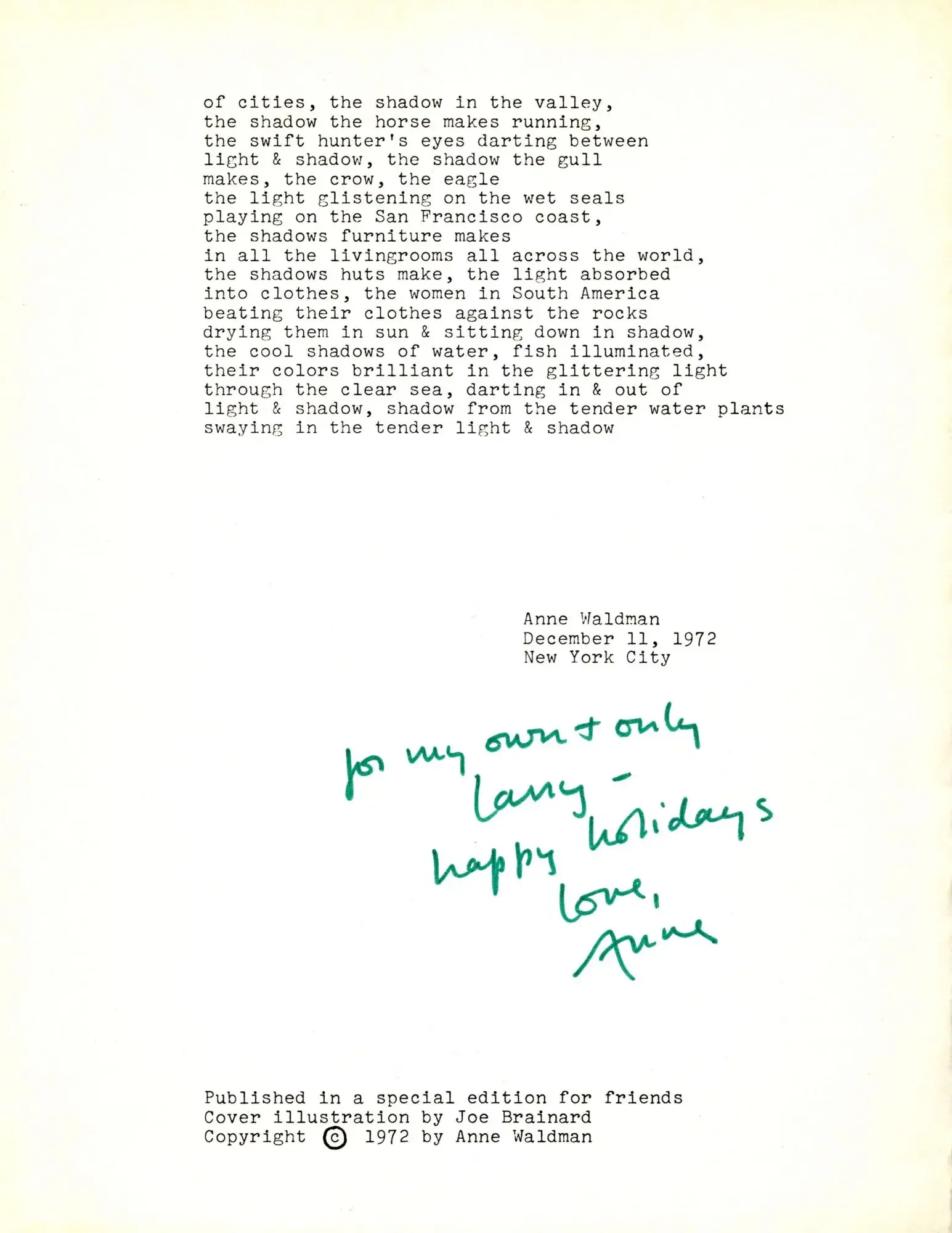 Published in a special edition for friends, this copy is nicely inscribed by Anne Waldman to poet / publisher Larry Fagin.