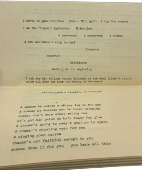 Titled poems include: Shaman, Murder of Pasolini Dream, Navigating the Dream, Poem, Journal, poem: Cocaine, Nijinsky Dream, Coda: The Eagle & Moon Goddess, December, Dream: Dylan & “Don”, along with untitled writing and several attributed extracts about shamans.