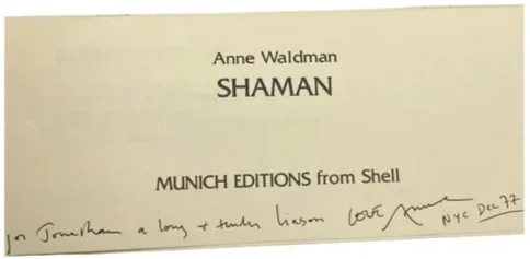 Per Allen Ginsberg, the poem Shaman is about Bob Dylan, who Waldman travelled with on tour as poet in residence. Inside drawing by Hatha. Cover photo by Gianfranco Mantega.