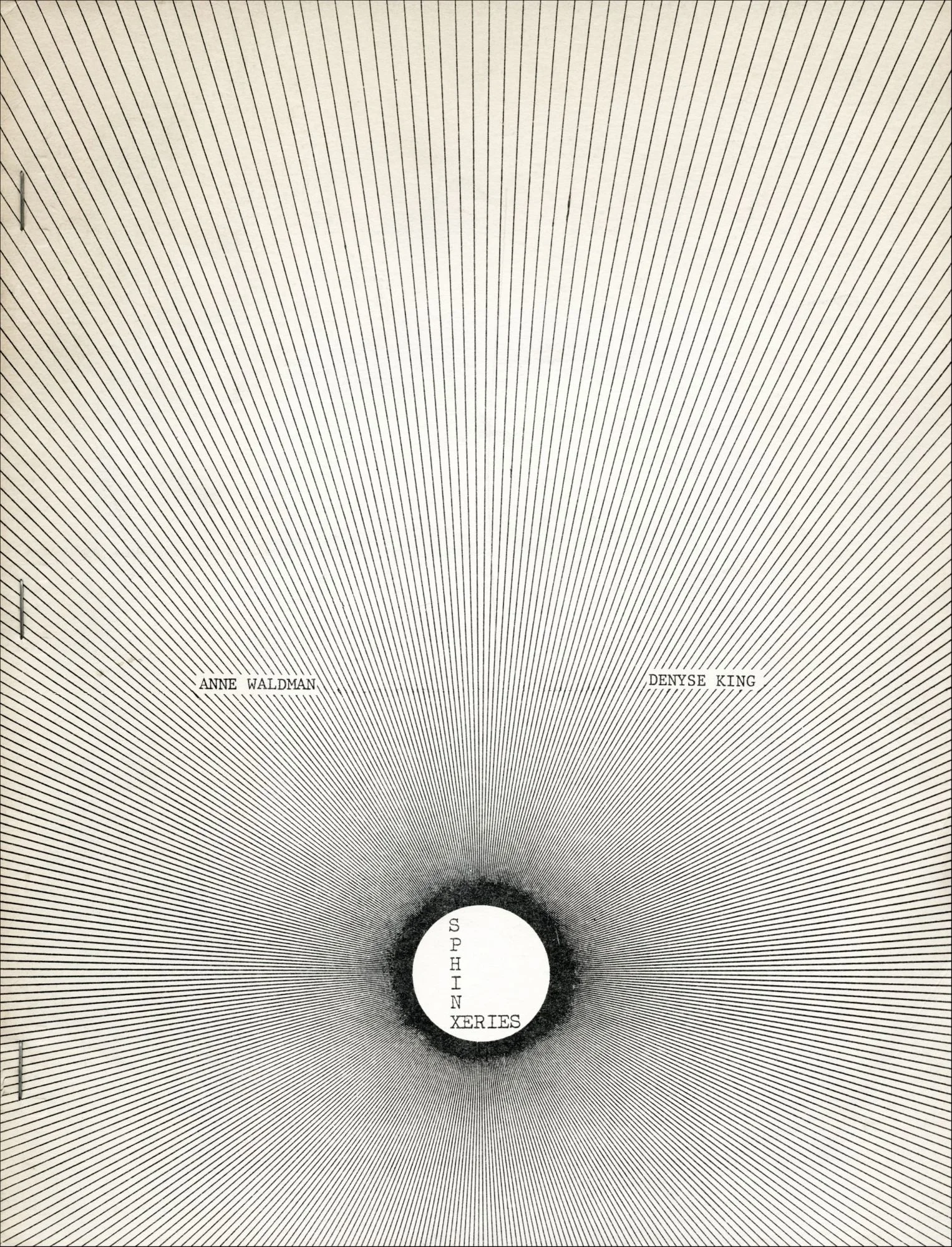 Side-stapled, 8 1/2 x 11 in., cover by Anne Waldman.